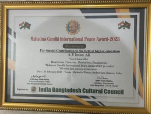 ইন্ডিয়া বাংলাদেশ কালচারাল কাউন্সিল আয়োজিত মহাত্মা গান্ধী ইন্টারন্যাশনাল পিস অ্যাওয়ার্ডে ভূষিত হয়েছেন বীর মুক্তিযোদ্ধা, প্রফেসর ড. এ এফ ইমাম আলী। তিনি বর্তমানে বান্দরবান বিশ্ববিদ্যালয়ের উপাচার্য হিসেবে দায়িত্ব পালন করছেন। উচ্চ শিক্ষায় বিশেষ অবদানের জন্য তাকে এ পুরস্কার দেওয়া হয়।