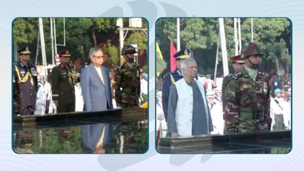 নিজস্ব প্রতিবেদক : সশস্ত্র বাহিনী দিবসে শিখা অনির্বাণে পুষ্পস্তবক অর্পণ করে শ্রদ্ধা জানিয়েছেন রাষ্ট্রপতি মো. সাহাবুদ্দিন ও প্রধান উপদেষ্টা ড. মুহাম্মদ ইউনূস। দিবসটি উপলক্ষ্যে বৃহস্পতিবার (২১ নভেম্বর) ঢাকা সেনানিবাসে সকাল